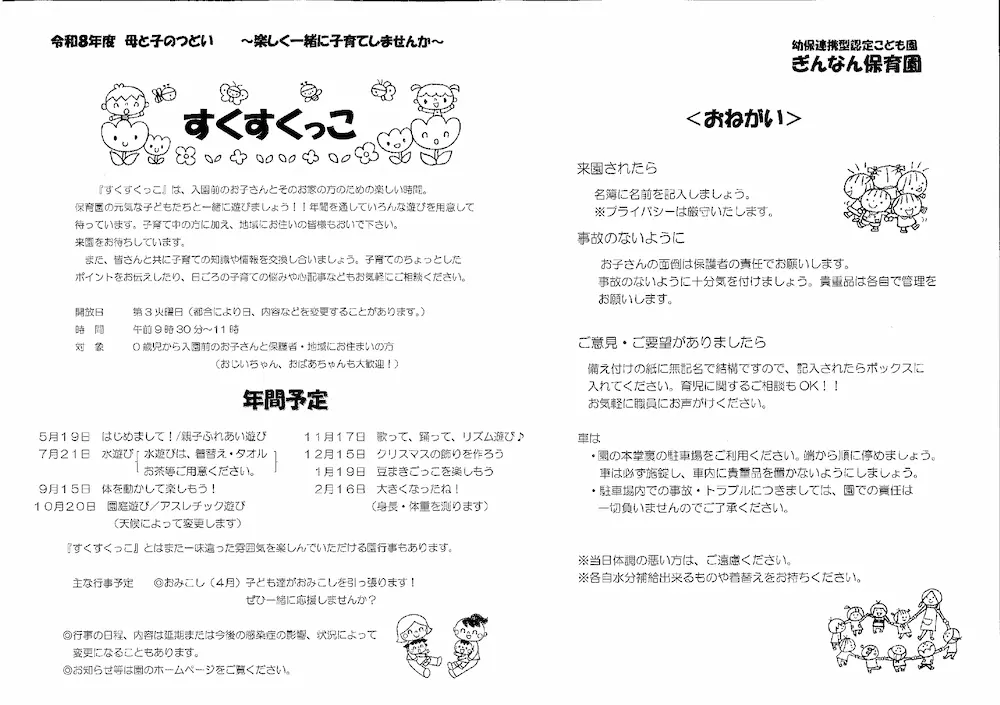 | 対象 | 0歳児から入園前のお子さんと保護者 (おじいちゃん、おばあちゃんも大歓迎!) |